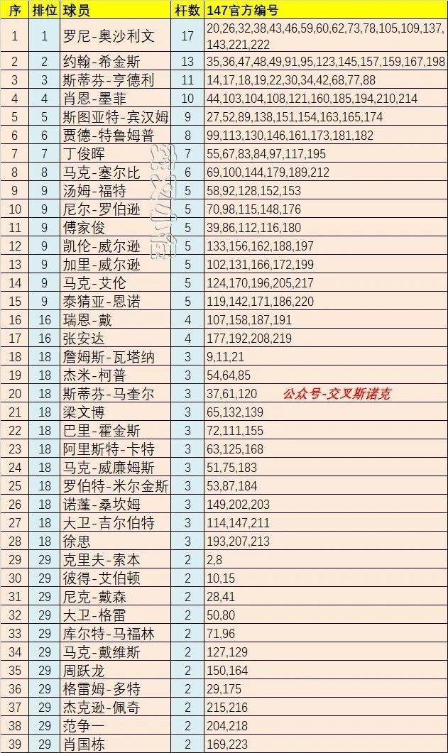 这是官方第223杆147,本赛季第6杆147。本赛季,才刚开始不久,就已经产出6杆147,照这速度,打破上赛季创下的单赛季15杆147的纪录,有希望。这是武汉公开赛历史上的第2杆147。武汉公开赛至今举办了三届,上一届斯佳辉打出首杆147(也是斯佳辉的个人首杆147)。