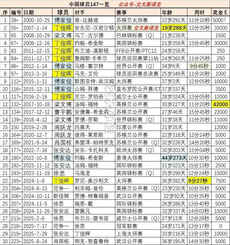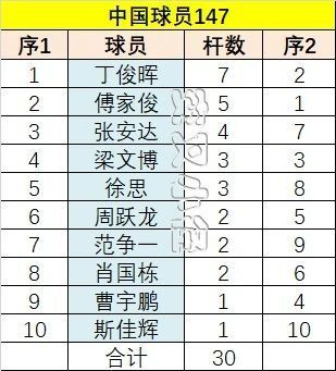 这也是中国球员打出的第30杆147。本赛季6杆147,中国球员贡献了3杆,范争一、张安达和肖国栋。